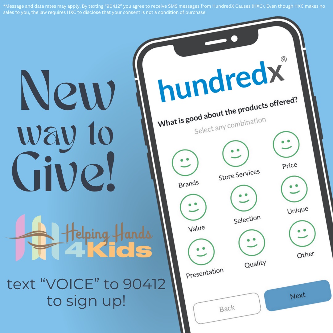 | Helping Hands 4 Kids is partnering again with Hundred X Causes to raise money for our organization by taking quick, one-minute surveys about stores & brands used every day. Our survey fundriser starts now and goes through February 3, 2026. To sign up, it’s easy. Text “VOICE” to 90412 and it will send you a link to sign up. Select “Helping Hands 4 Kids” from the drop down menu, and start taking surveys. Once you finish 75 surveys, it will stop messaging you and does not store your phone #. If you have any questions, please visit the FREQUENTLY ASKED QUESTIONS page. Surveys are available in both English and Spanish. Each survey takes less than a minute, and we get $1.60 for each survey you take (up to $120 per individual). Thank you for your on-going support! |